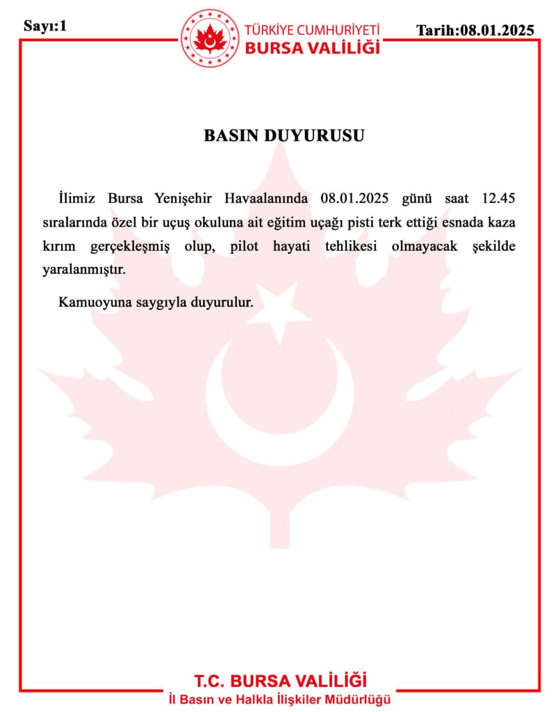 Olay saat 12:45’te Bursa Yenişehir Havalimanı’nda meydana geldi. Özel bir uçuş şirketine ait uçak eğitim için havalanacağı sırada henüz sebebi bilinmeyen bir durumla karşılaştı ve kaza kırıma uğradı.