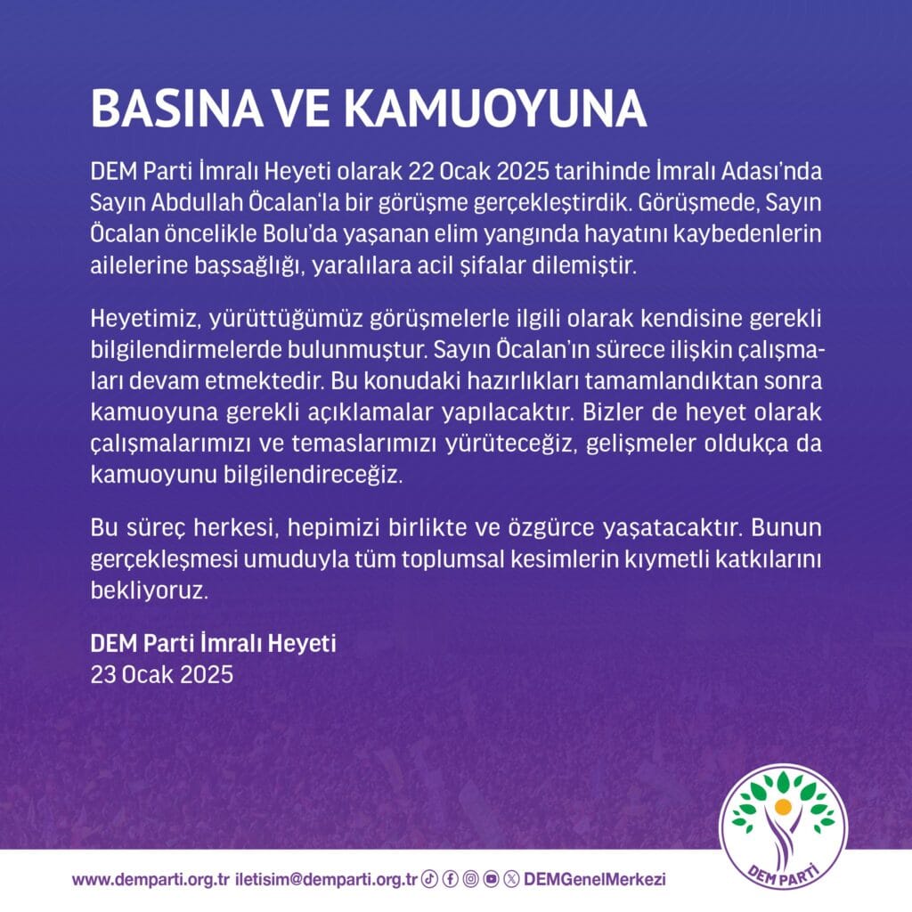 DEM Parti: “Sayın Öcalan, Bolu’da yaşanan elim yangında hayatını kaybedenlerin ailelerine başsağlığı, yaralılara acil şifalar dilemiştir.”