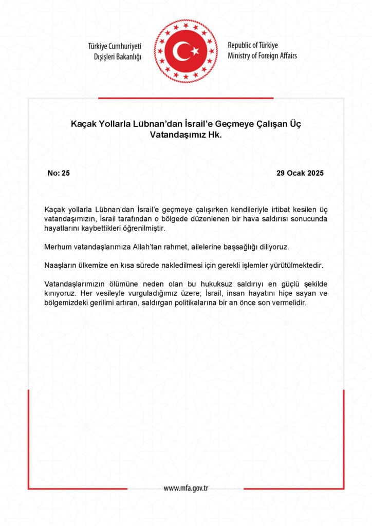 Son Dakika! Türkiye Dışişleri Bakanlığı, Lübnan sınırından İsrail’e geçmeye çalışan 3 Türk Vatandaşının, İsrail’in saldırısı sonucu hayatını kaybettiğini duyurdu.