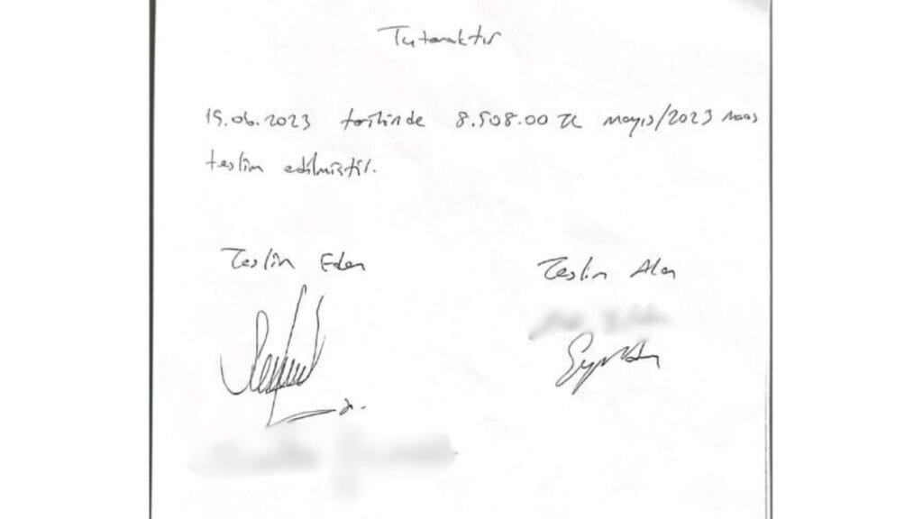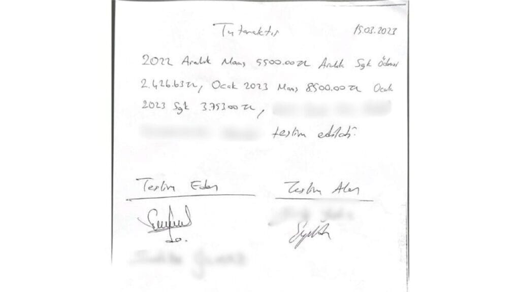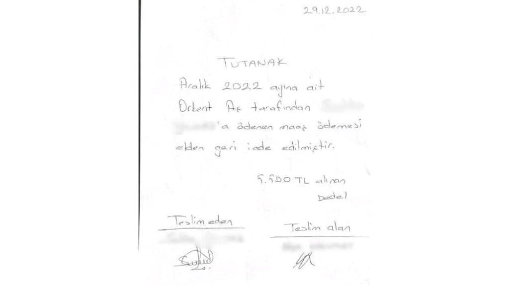 Bu adaletsizlik, mağdur çalışanlar tarafından belgelerle iddia edildi. Çalışanların ellerinde, maaşların tam yatırılmasının ardından geri alındığını gösteren bir dizi belge bulunuyor. Belgede ORKENT A.Ş. tarafından ödenen Mayıs 2024 tarihli maaş çalışan S.Y’nin hesabına yatırılıyor. Daha sonra maaş miktarından 8.508,00 TL bir başka ORKENT A.Ş. çalışanı olan E.Y. tarafından elden teslim alındığı belirtiliyor.
